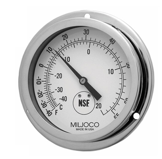 Miljoco Remote Reading Dial Thermometers are vapor-actuated instruments designed to provide accurate temperature readings from a distance in refrigeration and food service applications.